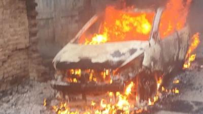 खड़ी कार में लगी भीषण आग, कुछ ही मिनटों में जलकर राख हुई गाड़ी, सड़क पर मची अफरा-तफरी
