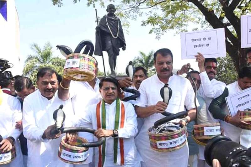 मध्य प्रदेश विधानसभा के बजट सत्र के दूसरे दिन कांग्रेस आक्रामक नजर आई और बेरोजगारी के मुद्दे पर अनोखे अंदाज में विरोध प्रदर्शन कर सरकार पर निशाना साधा। नेता प्रतिपक्ष उमंग सिंघार के नेतृत्व में कांग्रेस विधायकों ने विधानसभा परिसर में गांधी प्रतिमा के सामने टोकरी में सांप और तख्तियां लेकर रोजगार देने के मुद्दे पर प्रतीकात्मक विरोध प्रदर्शन किया।