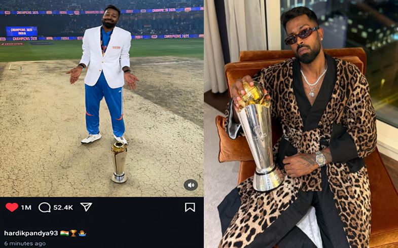 Hardik Pandya: ऑलराउंडर हार्दिक पांड्या ने चैंपियंस ट्रॉफी में बल्ले और गेंद, दोनों से महत्वपूर्ण योगदान दिया. क्रिकेट मैदान पर तो उन्होंने कई रिकॉर्ड बनाए हैं. लेकिन अब उन्होंने सोशल मीडिया पर भी एक बड़ा रिकॉर्ड बना दिया है. उन्होंने एक इंस्टाग्राम पोस्ट किया, जिसमें कुछ मिनटों में लाइक की संख्या लाखों में पहुंच गई. इस बीच उन्होंने विराट कोहली का एक बड़ा रिकॉर्ड भी तोड़ दिया. फाइनल जीतने के बाद हार्दिक पांड्या चैंपियंस ट्रॉफी को लेकर पिच पर गए, वह अपने साथ अक्षर पटेल को लेकर गए. ताकि वह उनकी फोटो खींच सके. इस दौरान करीब दर्जनों कैमरामैन भी वहां पहुंच गए. पांड्या ने पिच पर ट्रॉफी के साथ अपना आइकोनिक पोज दिया, जो उन्होंने 2024 टी20 वर्ल्ड कप जीतने के बाद भी दिया था.