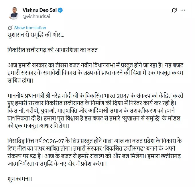 रायपुर। मुख्यमंत्री विष्णु देव साय ने वित्त वर्ष 2026-27 के लिए प्रस्तुत होने जा रहे छत्तीसगढ़ के बजट को प्रदेश के समग्र विकास की दिशा में एक महत्वपूर्ण कदम बताया और प्रदेशवासियों को शुभकामनाएं दी। उन्होंने कहा कि नवीन विधानसभा भवन में पेश होने वाला यह तीसरा बजट विकसित और समृद्ध छत्तीसगढ़ के निर्माण के लिए सरकार के विज़न को नई मजबूती देगा।