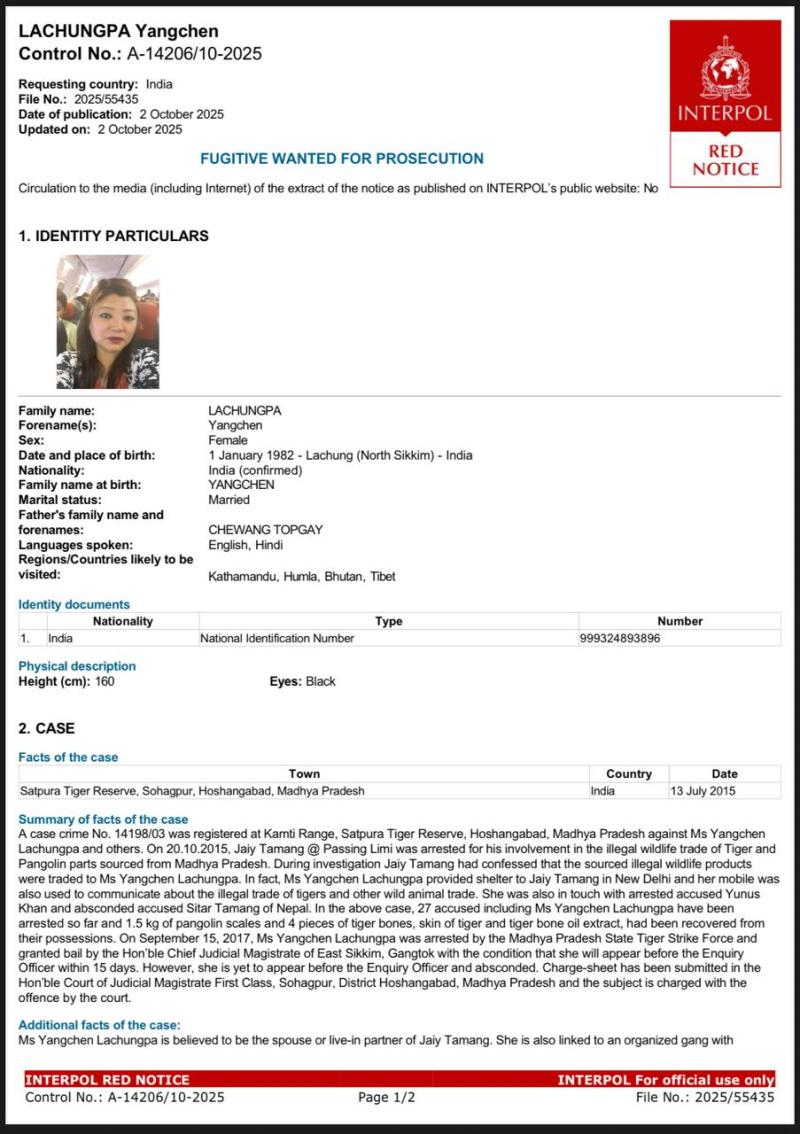 अपराधी यांगचेन लाचुंगपा गिरफ्तारी से बचने लगातार एजेंसियों को चकमा दे रही थी, अंत में 2 दिसम्बर 2025 को उसे मध्यप्रदेश स्टेट टाइगर स्ट्राइक फोर्स एवं केंद्र सरकार की वन्यजीव अपराध नियंत्रण ब्यूरो नई दिल्ली की संयुक्त टीम ने अत्यंत कठिन परिस्थितियों में कम तापमान के क्षेत्र में जाकर योजनाबद्ध तरीके से घेराबंदी कर लाचुंग, मंगन (सिक्किम) से गिरफ्तार कर न्यायलय गंगटोक के समक्ष पेश कर मध्यप्रदेश शासन का ठोस पक्ष रखने के बाद ट्रांजिट वारंट 3 दिसम्बर 2025 को रात्रि में प्राप्त कर उसे मध्यप्रदेश लाया जा रहा है। इस कार्यवाही में सिक्किम पुलिस का महत्वपूर्ण सहयोग रहा।